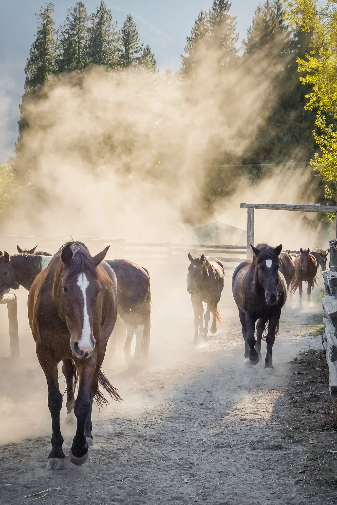The horses took a short snack break by the potato fields, which was a perfect spot for them to recharge and for us riders to bond with each other. After the short break, we reluctantly headed back to the stables. The afternoon had been incredible and the connection with my horse and the beauty of the lush valley left a lasting memory. To our surprise, Elizabeth invited us to stay behind a little longer when we returned to the stables, as all horses had finished for the day and were going to be let out all at once. She suggested it could be a perfect moment to take some good pictures. Indeed, she was right, as the photos of sunlight breaking through the flying dust when the horses came out were jaw-dropping.